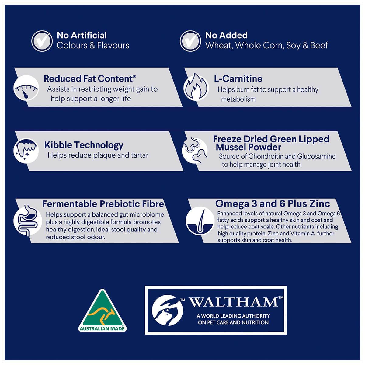 Formulated so that your dog maintains a complete and balanced vitamin/mineral intake whilst consuming fewer calories. To assist in weight loss, feed a combination of both wet and dry food to allow a larger meal to be fed, for the same number of calories