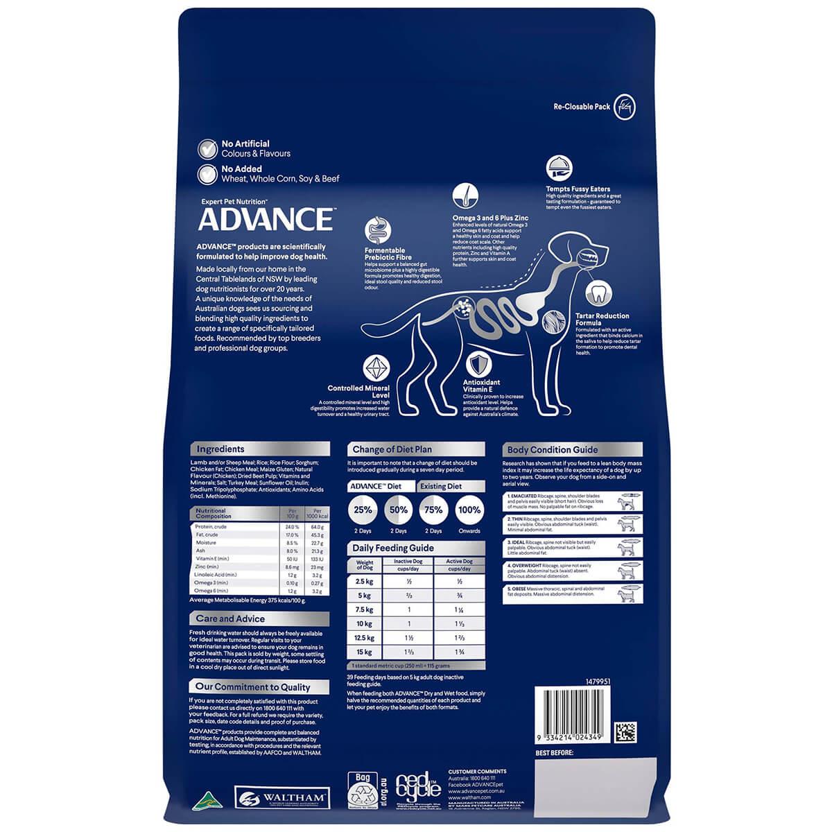 Advance dry dog food total wellbeing for toy and small breed dogs is a highly palatable and digestible, complete and balanced diet specifically designed for toy and small dog breeds. It contains essential vitamins such as vitamin C, vitamin E, beta carotene, taurine, plant extracts, zinc and linoleic acid, to work to improve skin and coat condition, and promote high levels of antioxidants. It is formulated to strengthen the immune system, reduce the risk of urinary tract infections and to improve dental health.