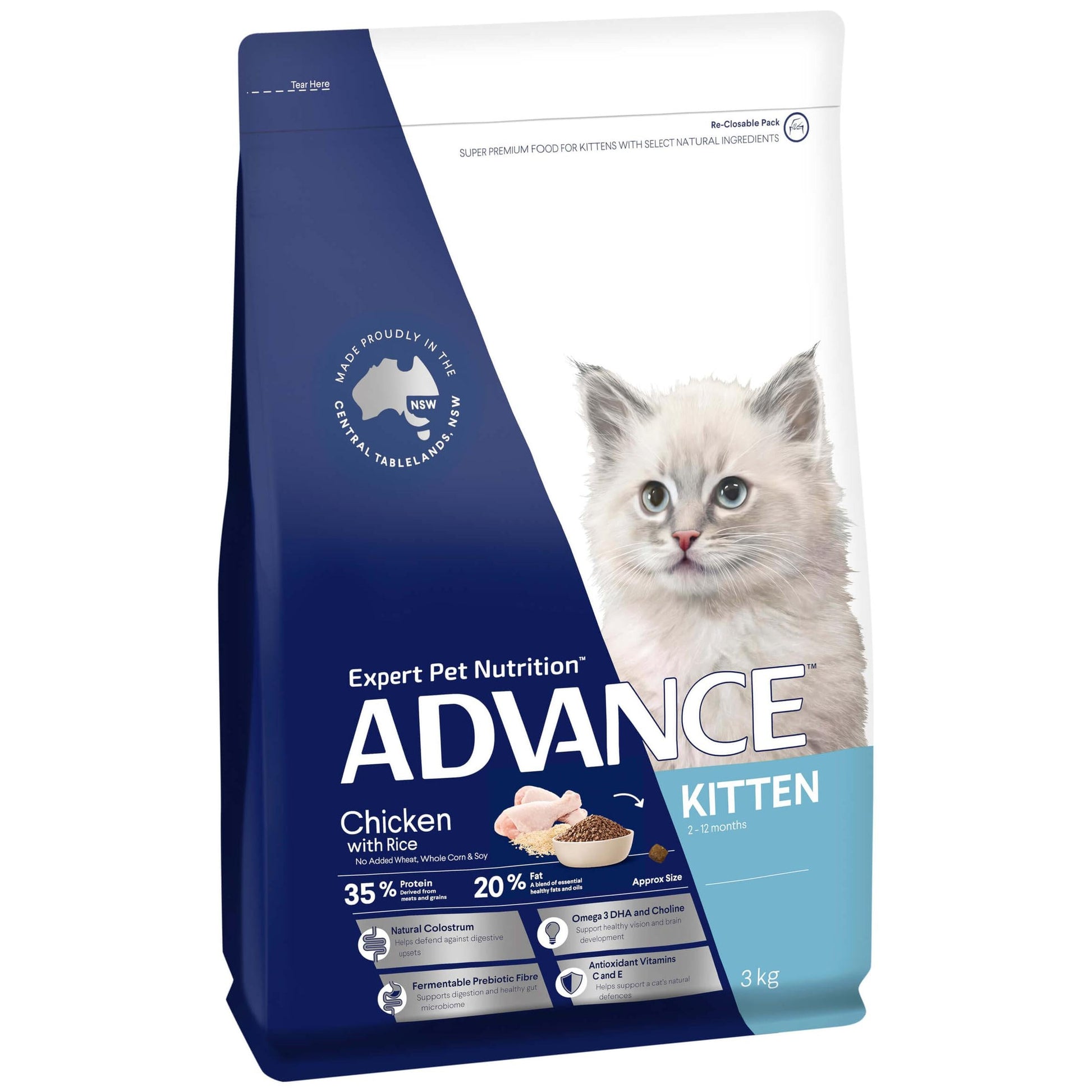 Advance Kitten Plus Growth Chicken has been specifically formulated to provide the optimal level of vitamins and minerals needed for growing kittens. It includes high quality Australian chicken as the main protein source, and has increased levels of antioxidants and enhanced quantities of DHA and Choline to promote healthy brain development. It also contains added Yucca extract, which helps to reduce the amount of litter box odour, plus enhanced levels of zinc and linoleic acid which help improve skin and coat conditions. Advance Kitten has been designed for kittens from weaning until 12 months, and can also be used for gestating or lactating mothers.