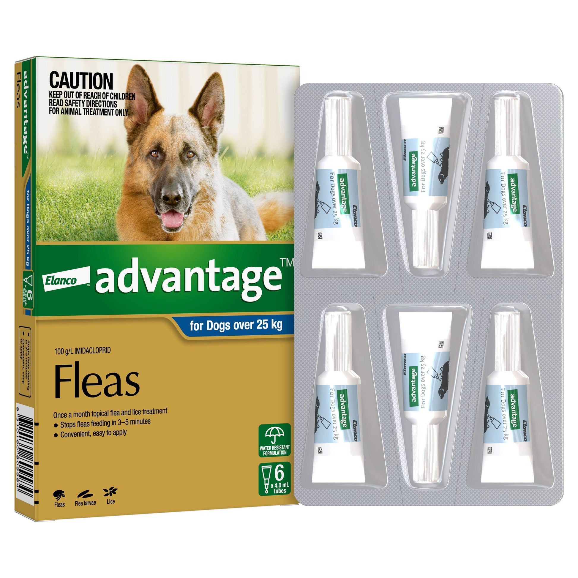 Advantage (blue) for large dogs is a safe and effective spot-on treatment for the control of fleas and biting lice for your dog, with IMIDACLOPRID as the active ingredient. An easy and convenient once monthly application will produce long lasting results on your dog for up to a month.ÿ Advantage is rapid acting; fleas stop biting in 5 minutes and are dead in 20 minutes.ÿ Advantage provides effective control of fleas and lice; it prevents the development of flea larvae and kills re-infestations with new adult fleas for up to one month after treatment, and larval flea stages are killed in the surroundings of treated pets. Advantage is safe for both you and your pets ? it is non-staining , non-sticky and has no strong chemical smell, and is suitable for puppies and kittens from weaning. Advantage is water fast so pets can swim, be shampooed or play in the rain without affecting treatment. Use only as directed on the label and use correct size product only.
