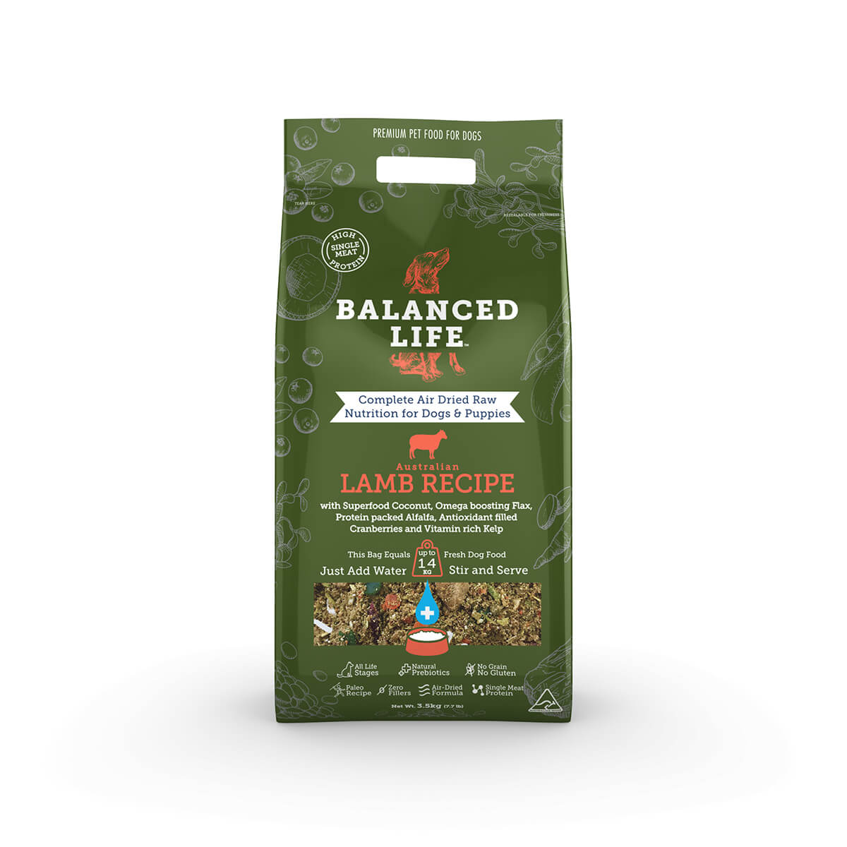 Our Rehydrate Lamb Recipe contains 100% air dried sustainably sourced raw Aussie Lamb blended with superfoods including alfalfa, coconut, cranberries and kelp.