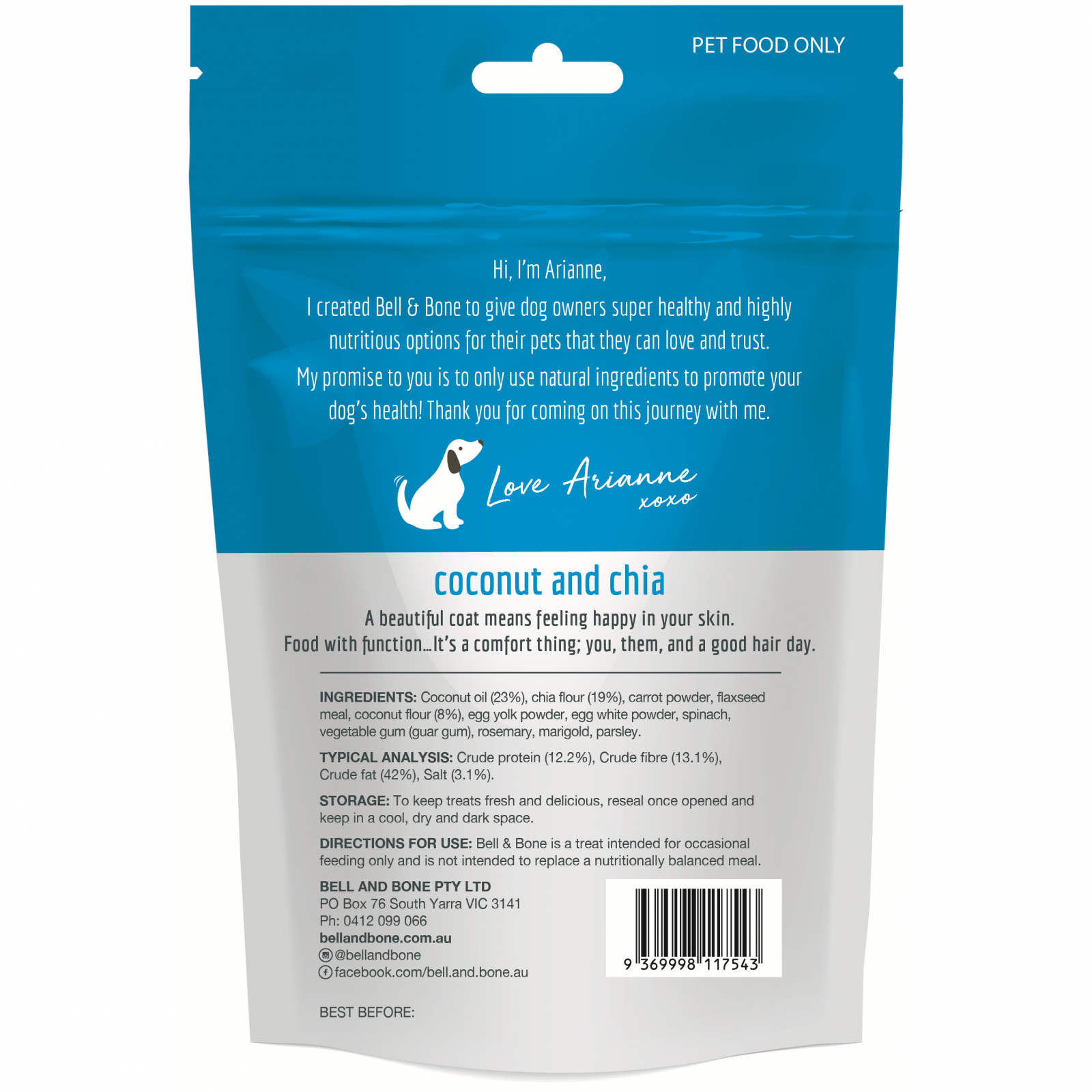 Coconut and Chia for beautiful coats is great for all dogs who are prone to itchy skin or want to help their coats shine. Full of omega-3 fatty acids, antioxidants and only the good stuff!
