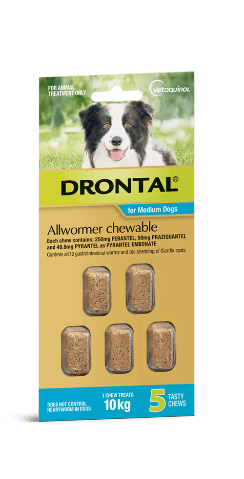Drontal all wormer beef flavoured chews are for the control of Roundworm, Hookworm, Whipworm and Tapeworm in dogs. Drontal is safe, no fuss and easy to administer in a tasty, chewable, meat flavoured treat. Each tablet treats up to 10kg.
