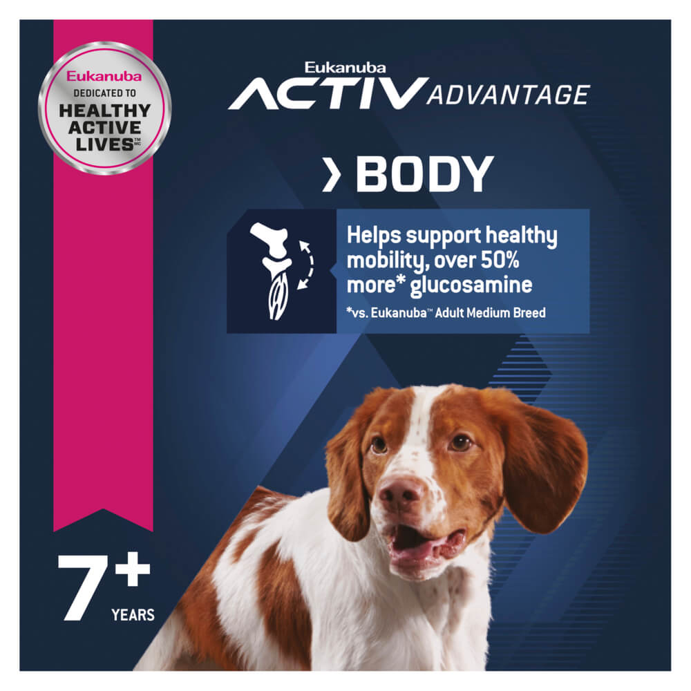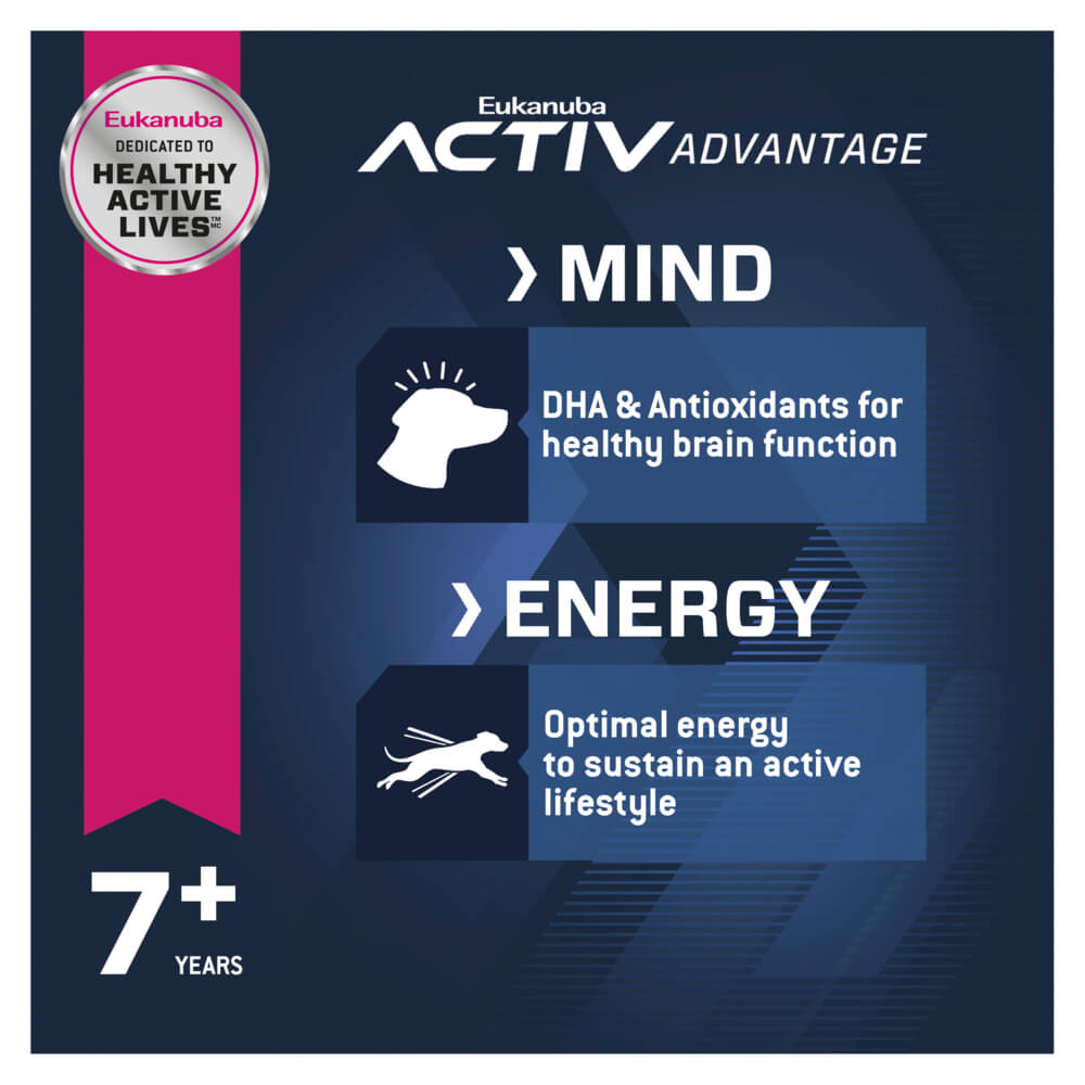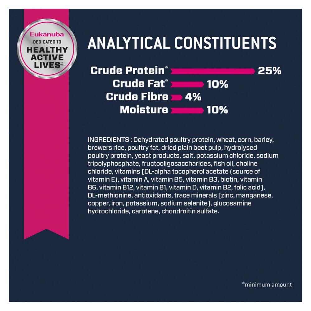 Eukanuba Senior Maintenance Formula is a nutritional breakthrough for senior dogs. It provides an optimal balance of appropriate protein, fat, calories, vitamins, and minerals for the aging dogs. As dogs age, they typically need fewer calories from fat, but protein is critical to their diet to ensure the proper maintenance of muscle tissue. Reducing protein at the same rate that fat is reduced can result in deterioration of muscle mass needed for vitality throughout the senior years. Eukanuba Senior Maintenance Formula supports muscle mass with precise levels of high-quality chicken protein, and is scientifically formulated for the special needs of a senior dog's digestive system. Eukanuba Senior Maintenance Formula contains an exclusive formulation of fibre (beet pulp and fructooligosaccharides) to nutritionally stabilize the senior dog's digestive system and support a healthy intestinal environment.