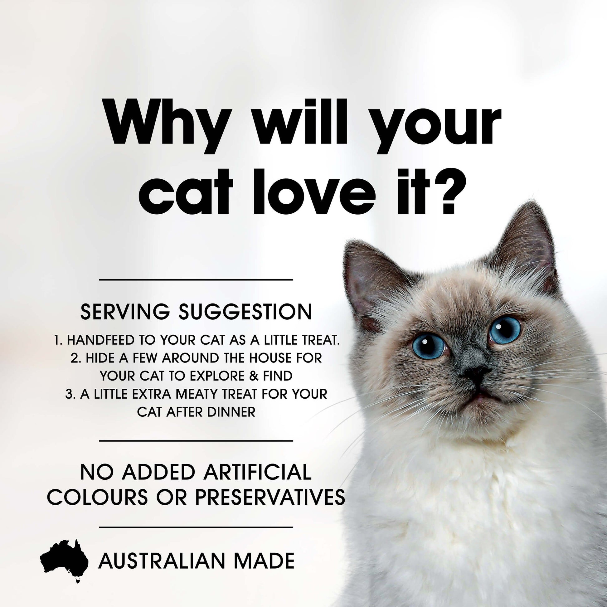 If you play a bit of hide and seek with your loved one then try it with Fussy Cat Crunchers with Kangaroo cat treat. Not only is it a crunchy but with real Australian meat as the main source of protein it tastes great too. Your cat won't be able to resist seeking them out Want a few other ways to use Crunchers 1.Handfeed to your cat as a little treat. 2. A little extra meaty treat for your cat after dinner A choice of 4x tasty grainfree meat flavours for your cat to enjoy. Be careful to not give them too many