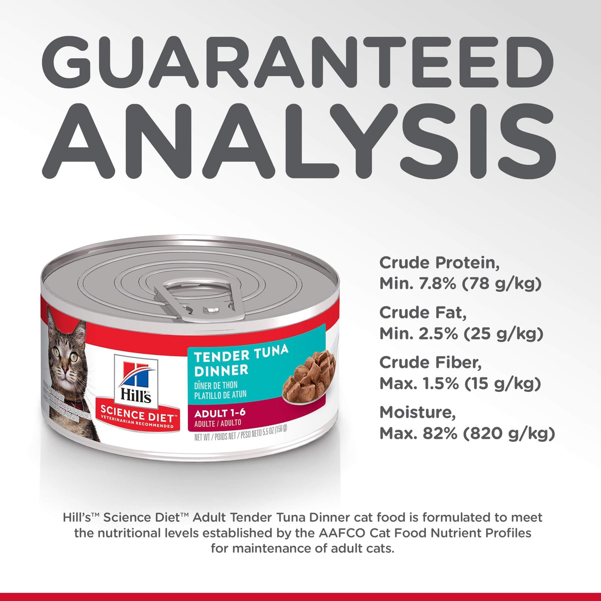 Hill's Science Diet Adult Tender Dinners Tuna Canned Cat Food is made from tasty chunks of tuna is gravy that your cat is sure to love. Designed to provide balanced nutrition this food will leave your kitty feeling happy and healthy.
