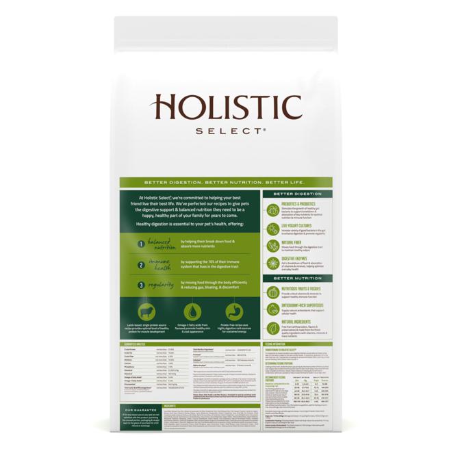 Holistic Select Lamb, Rice and Oatmeal is formulated with meal from range fed lamb, and enhanced with whole brown rice and oatmeal. It also contains taurine for healthy eyes and heart; glucosamine for healthy joints, as well as Vitamins A, C, E and beta-carotene to enhance the immune system and slow cell deterioration. Allergy affected dogs will benefit from the single source, hypoallergenic, animal protein.
