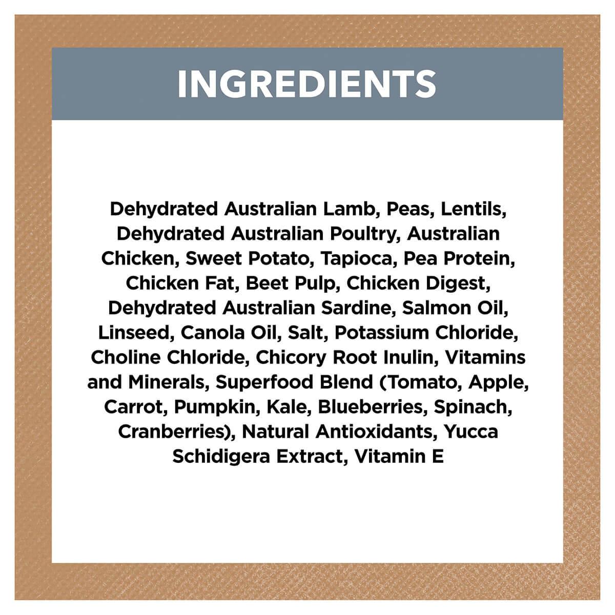 Using only the highest quality Australian-sourced ingredients, this high-protein and hypoallergenic grain free dry food promotes healthy digestion and is packed full of wholesome ingredients including a high concentration of quality protein from Lamb for lean muscle maintenance.