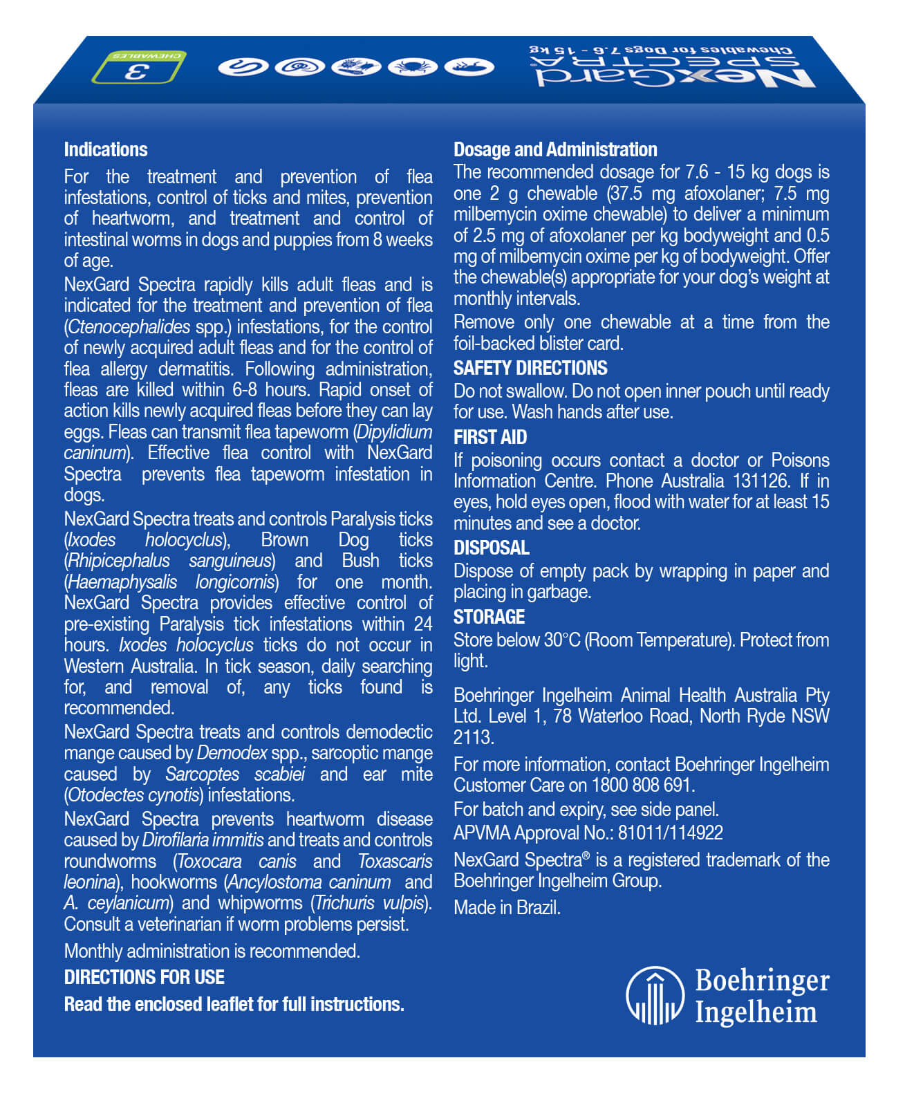 NexGard Spectra provides full protection against all the nasties - fleas, ticks, heartworm and intestinal worm. This monthly chew packs a punch, rapidly killing fleas and controlling 3 types of ticks and 4 types of worms. It's tasty beef flavour makes it easy to administer - just give it to your dog the same way you would a treat!