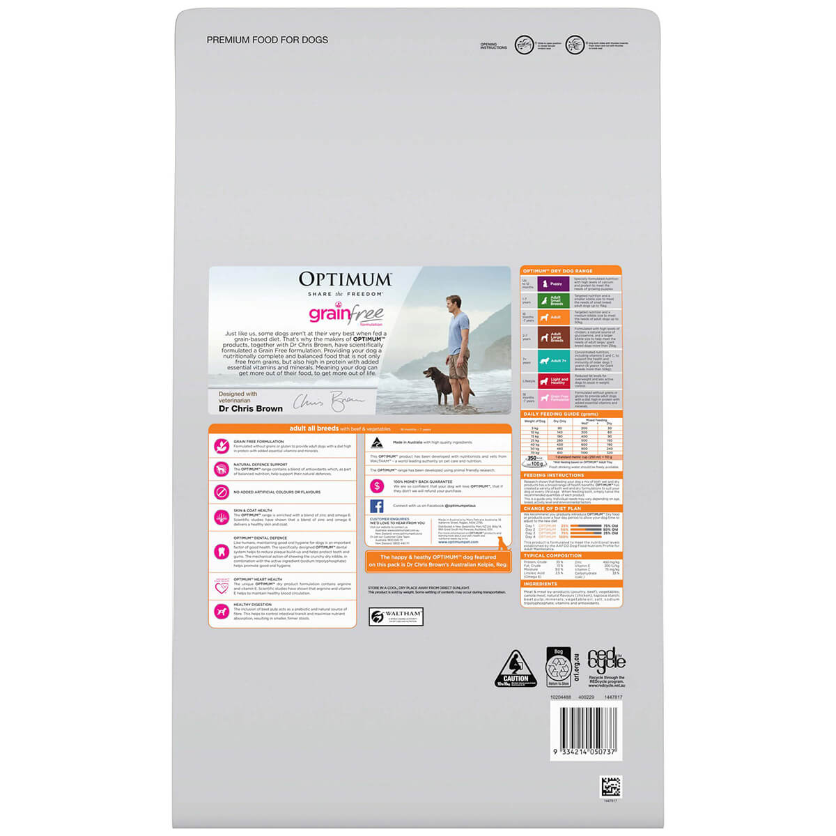 Optimum Adult Grain-free Beef and Vegetables Dry Food is a balanced, and nutritionally complete dry food diet for adult dogs. Formulated with a grain-free formula, this diet is also enriched with beet pulp to provide a natural source of fibre. This helps to control intestinal transit and maximise nutrient absorption which results in smaller, firmer stools.