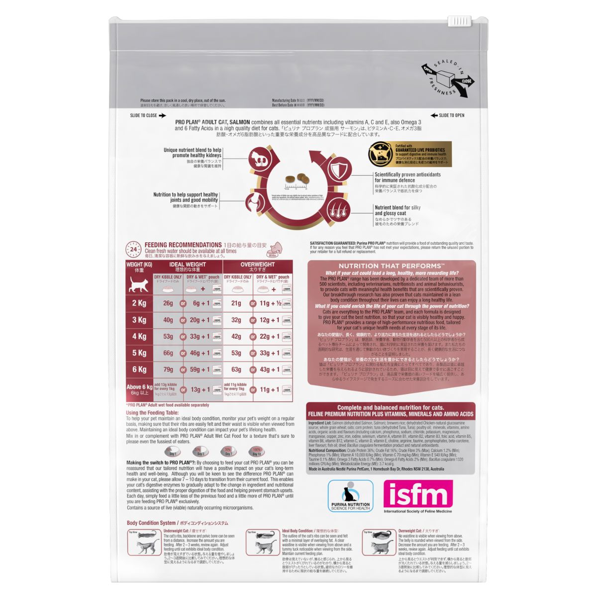 PRO PLAN Adult Cat, Salmon combines all the essential nutrients including vitamins A,C and E, also Omega 3 and 6 fatty acids in a high protein diet for cats.