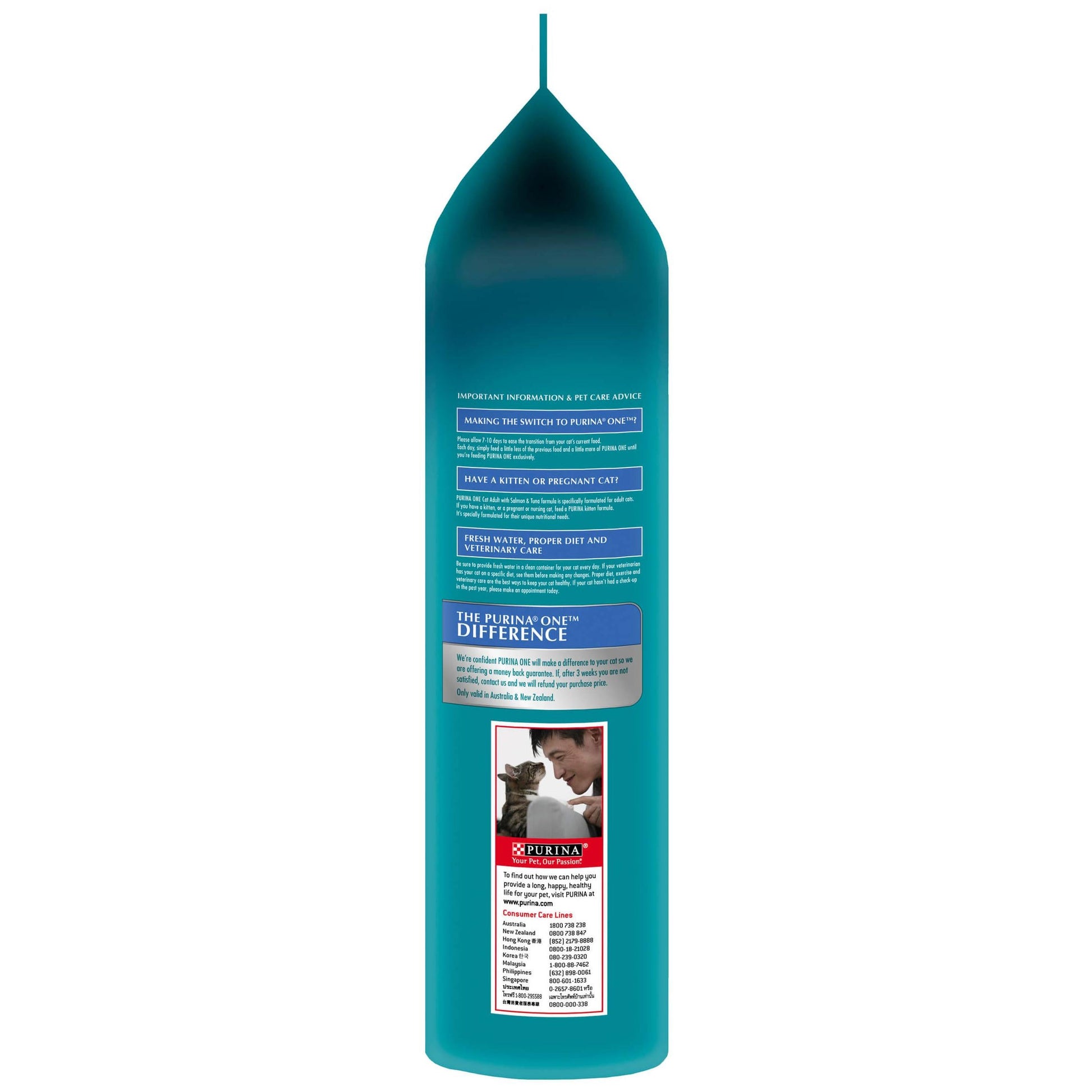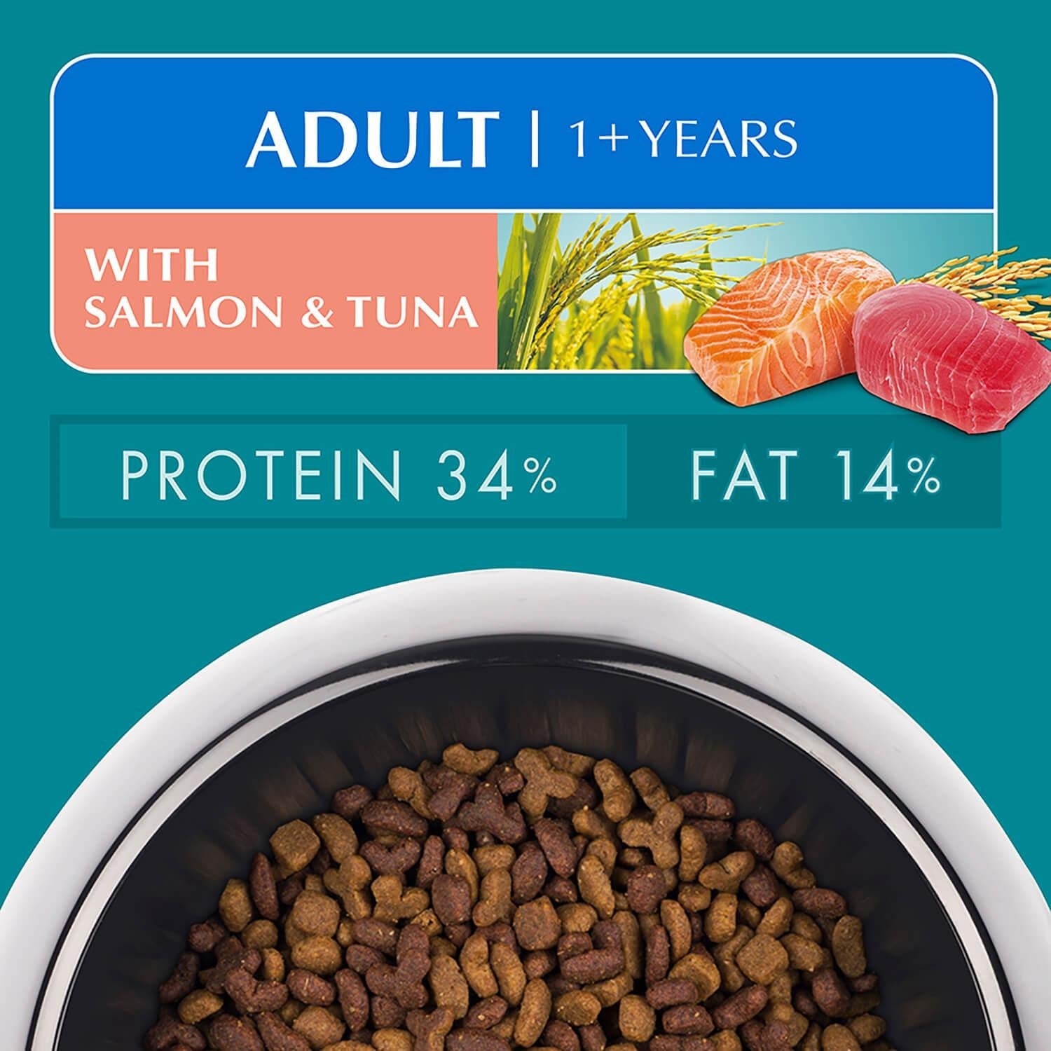 PURINA ONE Adult 1+ Years Cat Food with Salmon & Tuna is highly digestible for optimal energy absorption and promotes dental health by reducing plaque build up. Developed by PURINA nutritional scientists, it contains 34% protein and 14% fat.