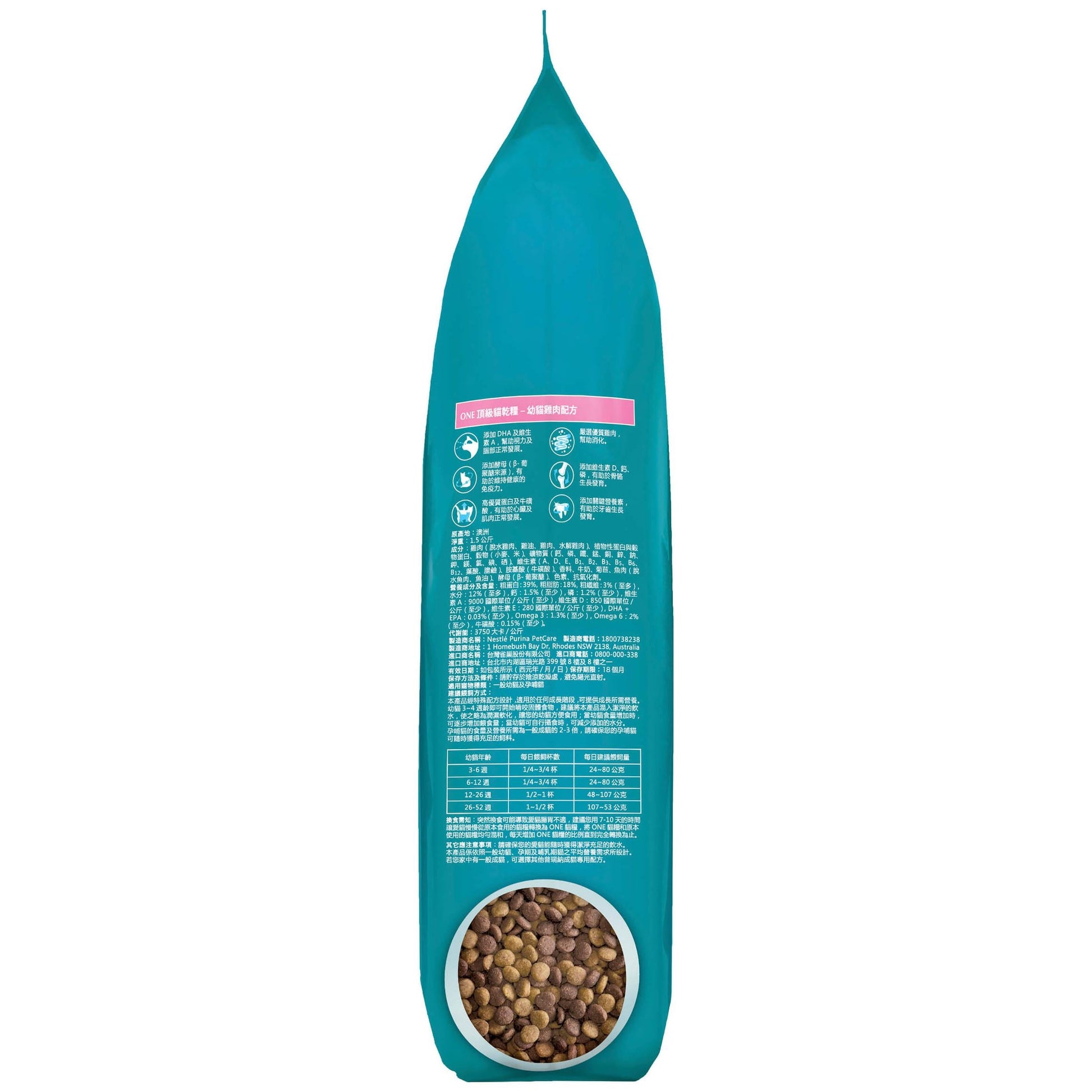 Purina One Kitten Food 1-12 Months With Chicken promotes vision and brain development with DHA & Vit. A. Supports immune health w/ yeast 1.3 Beta Glucans and maintains healthy heart and muscle growth. Contains 39% protein and 18% fat.