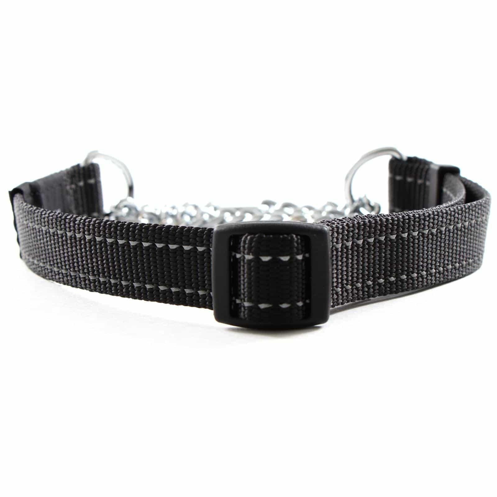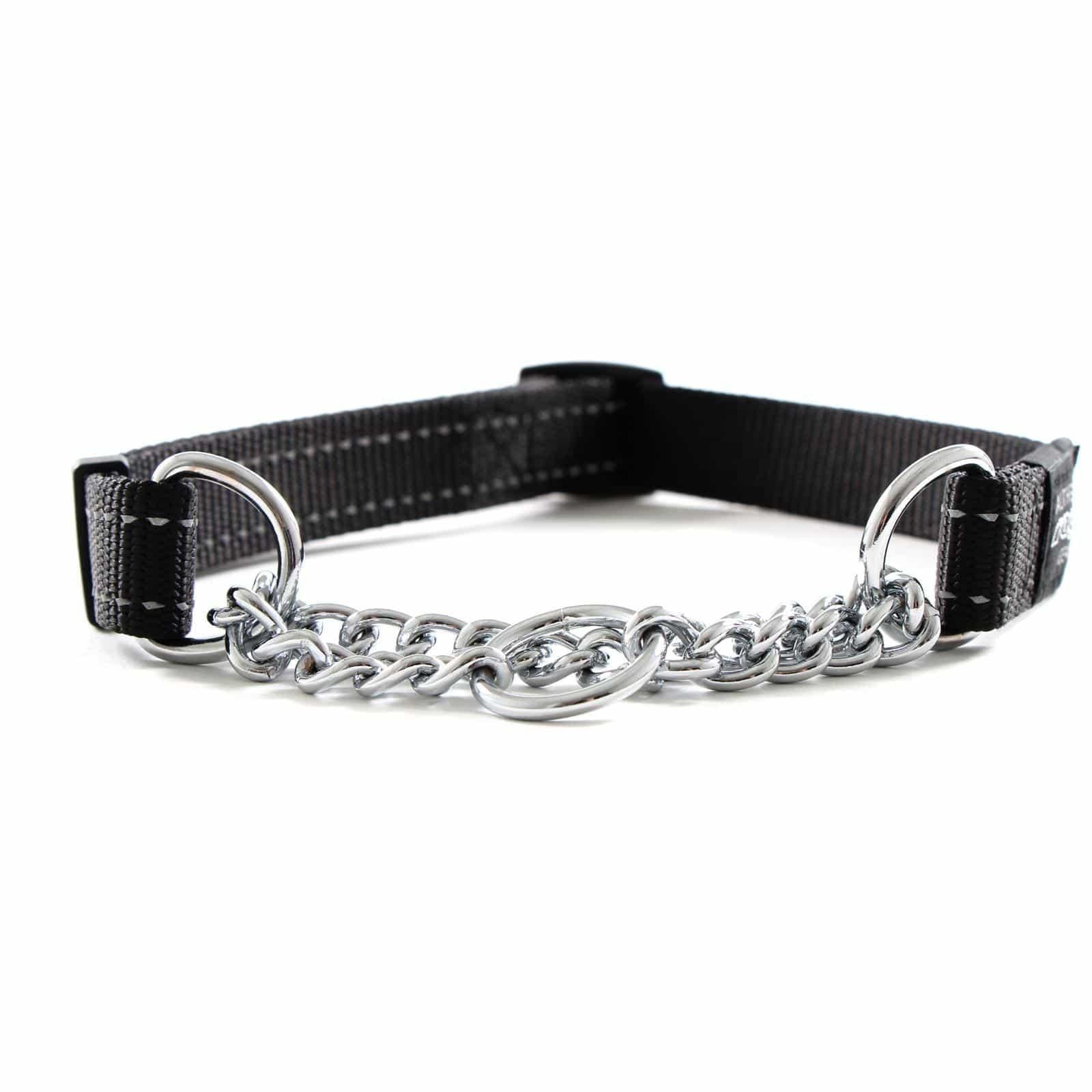 Got a pug that tugs? Got a Dane that strains? Got a Bull Terrier thats a pull terror? OK, that last one was a bit of a stretch. But you can stop stretching behind your pulling pooch with this half check collar! Thanks to the combination of high strength nylon webbing and stainless steel chain, you can now have all the control of a choker without the dreaded choking and fur catching effects! Your dog will stay under control and your shoulder will stay in its socket with this muscle saving collar. Reflective yarn is also woven into the nylon webbing to increase visability for those evening walks.