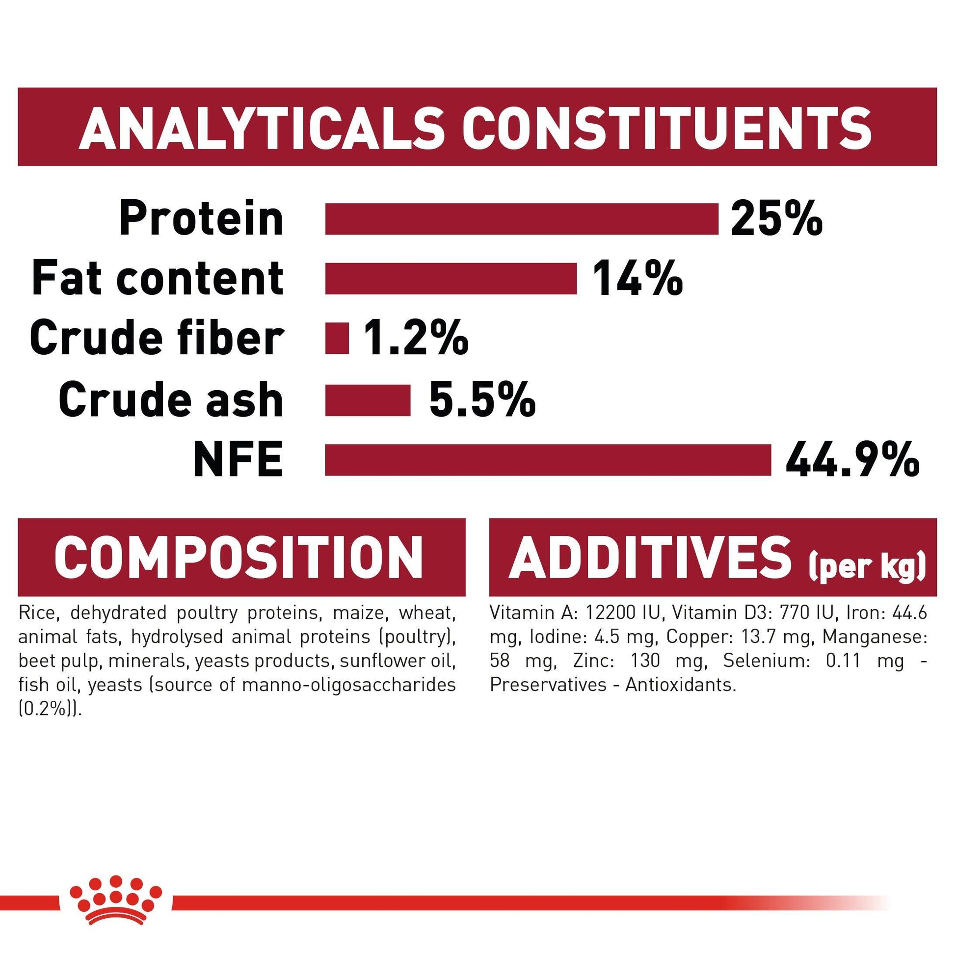 Royal Canin Adult Medium dog food is specially formulated to meet the requirements of fully-grown medium-sized breeds, with a moderate fat content and a great taste. A medium breed dog can be defined as a dog whose adult weight is between 10-25kg, from 12 months to 7 years of age. Examples of medium breed dogs are the Beagle, Whippet, English Setter, English Springer Spaniel, Airedale Terrier, Bull Terrier, Whippet, Dalmatian, Shar Pei, Tibetan Terrier, Bulldog, Siberian Husky, Samoyed, and Border Collie. Medium breed dogs often spend a lot of time exercising outdoors in all conditions, exposing them to micro-organisms and parasites, and can be susceptible to injuries. As a result, the immune system of medium dogs is often under strain. Royal Canin Adult Medium is formulated with powerful ingredients, such as mannan-oligo-saccharides, that promote strong natural defences and can assist in supporting their skin, coat and overall vitality. High levels of animal protein make Medium Adult easy to digest, while the balanced combination of omega 3 and 6 fatty acids promotes a thick, shiny coat. The formula has a high digestibility, to ensure optimal digestion of food; a balanced intake of high fibre, plus selected natural flavours and a specially designed kibble shape, size and texture.