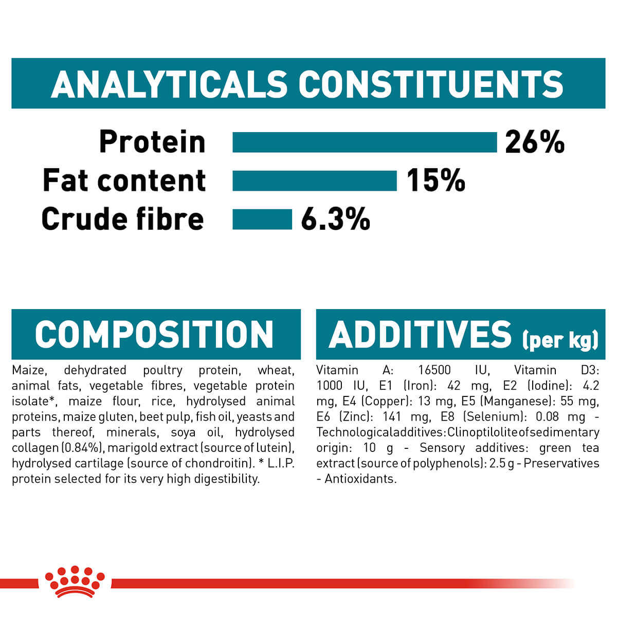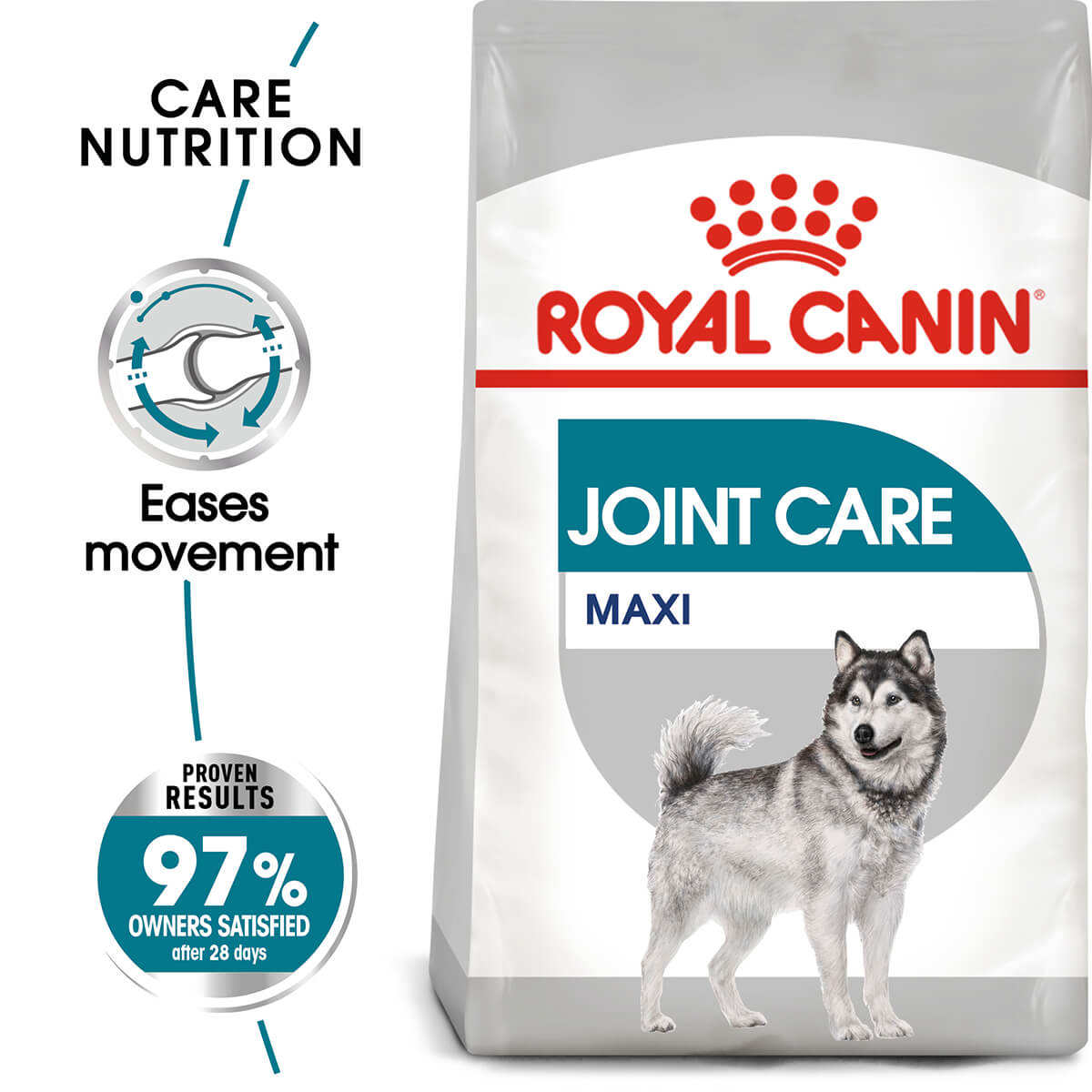 Healthy joints make moving easy. Large dogs - especially active ones - can place added pressure on their joints, which over time may become sensitive and slow them down. Royal Canin(R) Joint Care Maxi is formulated to provide advanced nutrients, including collagen, one of the building blocks of cartilage to help support healthy joints along with green tea polyphenols. Excess bodyweight affects many of today's dogs and can contribute to joint sensitivity. Royal Canin(R) Joint Care Maxi contains a reduced calorie to help maintain a healthy bodyweight and is available as a dry kibble. Please follow the feeding guidelines based on your dog's ideal adult bodyweight. Suitable for large breed adult dogs (26-44kg) to support joint health.
