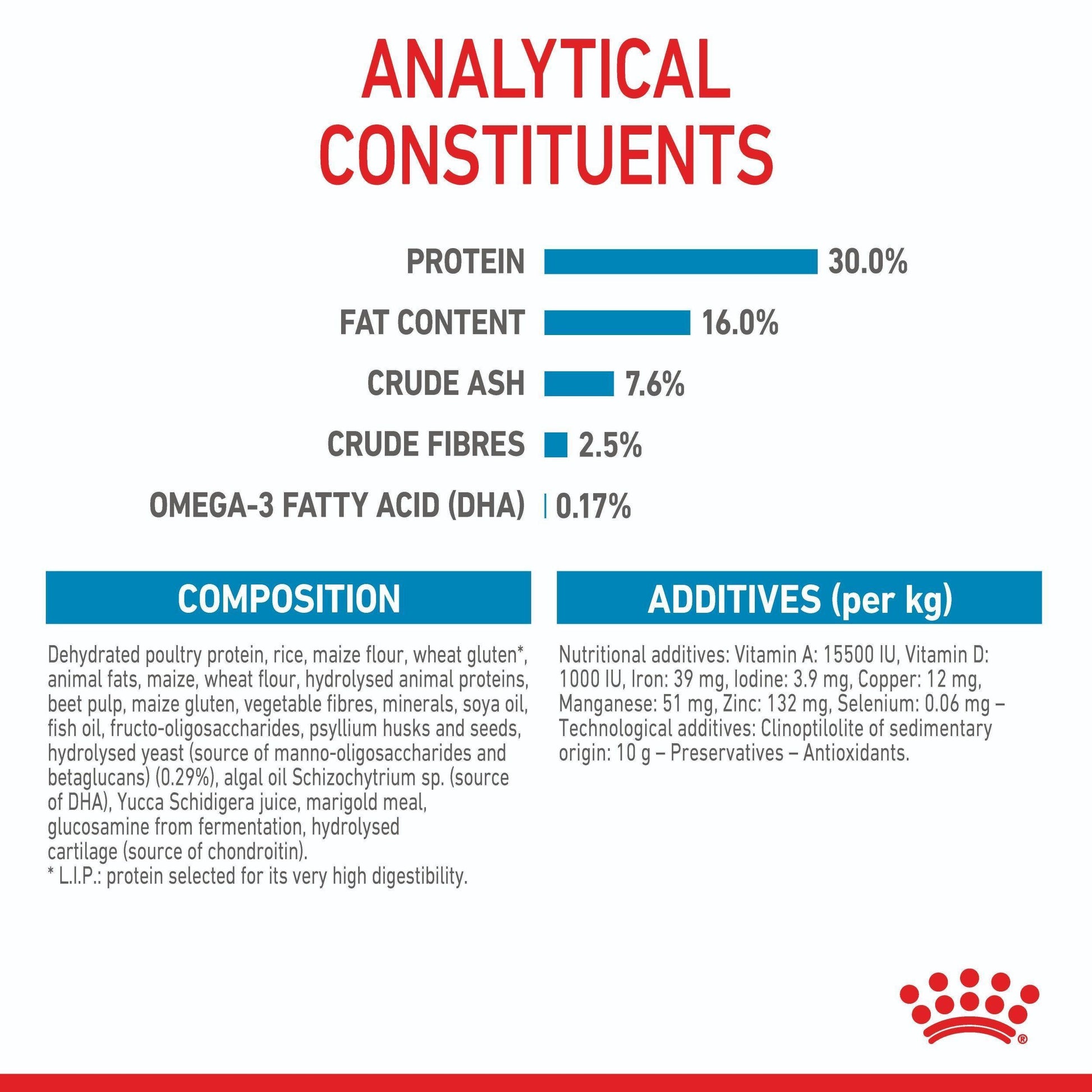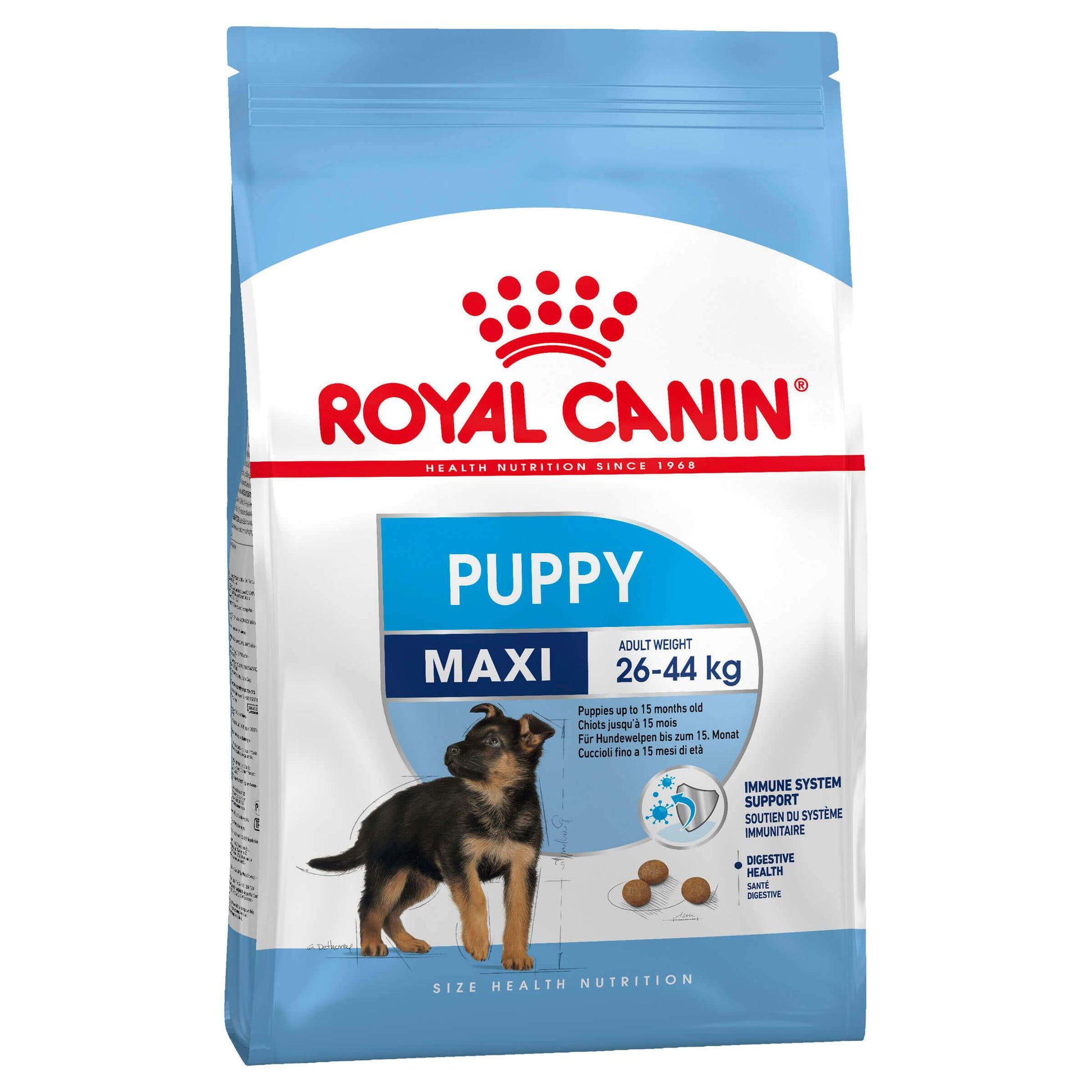 Royal Canin Junior Maxi is specially formulated for the needs of maxi breed puppies. During their growth period, large-breed puppies multiply their birth weight 70-90 times, and take 14 to 18 months to fully develop. This longer growth period involves higher risks of bone or joint cartilage disorders, meaning that maxi breed puppies require specifically adapted nutrition during their unique long growth cycle. Feeding them a diet that is too high in energy can accelerate growth without allowing enough time for proper bone and skeletal development. They need a diet with a controlled amount of energy to limit rapid weight gain, with fructo-oligosaccharides for optimal digestion and with balanced levels of calcium and phosphorus to promote optimal skeletal development. Maxi Junior is formulated to meet the specific needs of large breeds during the growth phase, containing high-quality animal protein (chicken, turkey, fish, egg, casein). The balanced mix of essential fatty acids promotes a thick, shiny coat, while the fibre content ensures healthy digestive functions. Added taurine promotes healthy heart function and stimulates heart contraction, and glucosamine and condrotin assists with maintaining healthy joint function. The inclusion of fatty acids EPA and DHA, insoluble mineral salts and sugar beet pulp help to promote intestinal health, facilitate intestinal transit and improve the quality of stools. Maxi Junior is ideally sized to fit the mouths of large-breed puppies, and is specially formulated with exclusive and natural flavourings to satisfy the fussiest of appetites.