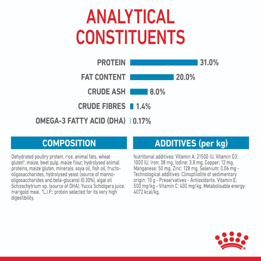 Royal Canin Junior Mini is a complete dry food for small breed puppies (adult weight up to 10 kg) up to 10 months old. Royal Canin Mini Junior is specifically formulated to help meet the high energy requirements of small breed puppies during the growth period, and support strong muscle development and skeletal formation. It is formulated with a selection of exclusive flavourings guaranteed to satisfy even the fussiest of small breed appetites, and have a specially designed kibble size and shape for small mouths. The inclusion of a patented antioxidant complex and prebiotics help to support the growing small breed puppy's natural defences, and L.I.P. proteins support digestive health and development.