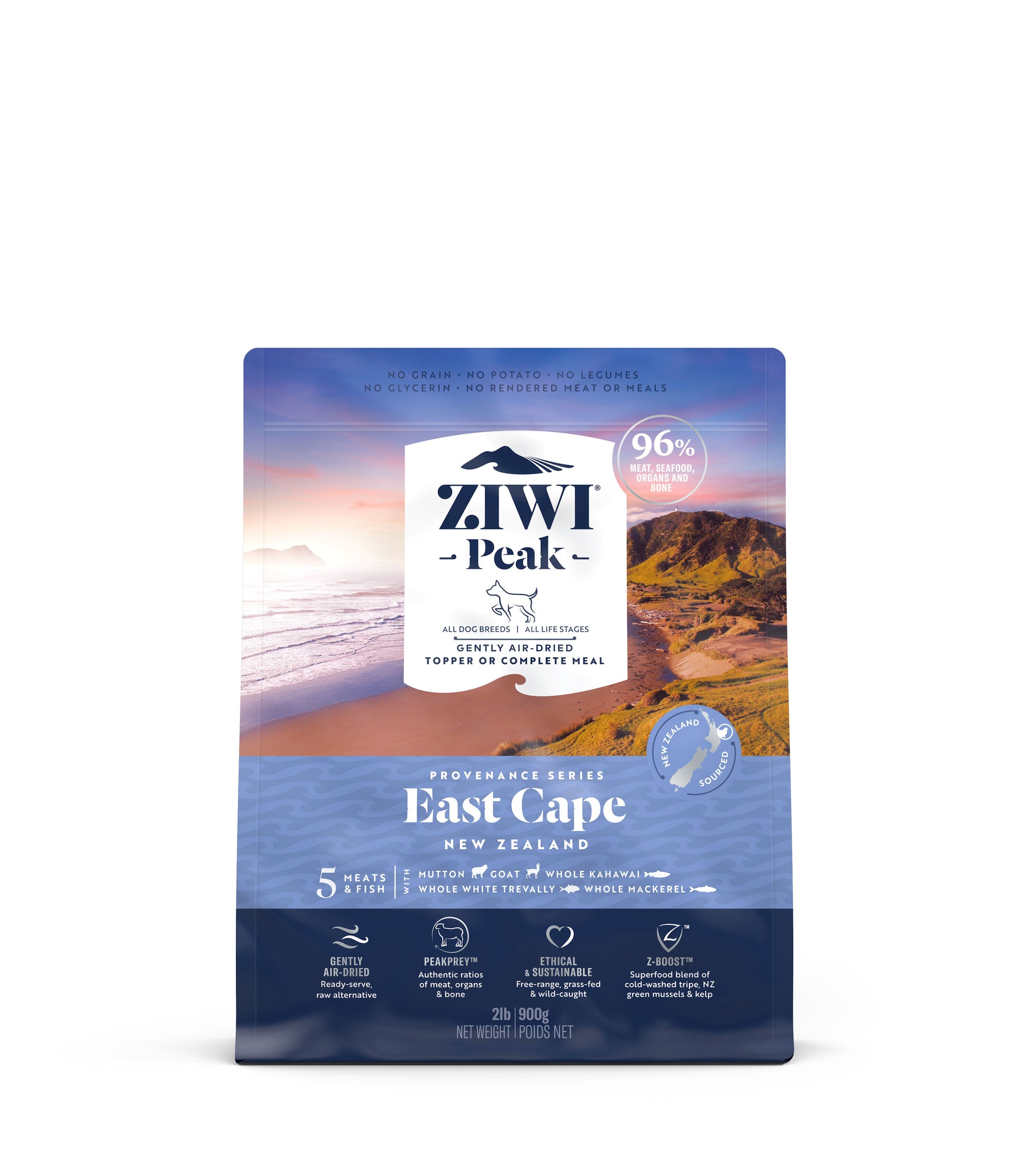Provenance Series East Cape Air-dried recipe for Dogs The first place on earth to see the sunrise, New Zealand’s spectacular East Cape is the inspiration behind ZIWI Peak’s East Cape Provenance recipe. Featuring free-range mutton and goat combined with a blend of wild-caught fish from Cape Reinga.New Zealands green pastures and pristine waters produce world class ingredients. This recipe includes unmatched inclusions and a variety of free-range and grass-fed meats and wild-caught fish all in authentic PeakPrey(TM) ratios. We combine the best of raw and fresh diets with the safe convenience of dry foods. Served as a topper or a complete meal dogs will be sure to love and pet guardians will feel good about feeding too.